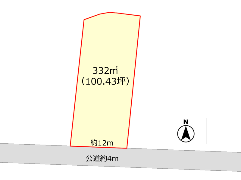 接道:南側約4m公道に接面約12m。公営水道敷地内配管(引込25mm)はありますが、建物への引込は未接続。 |